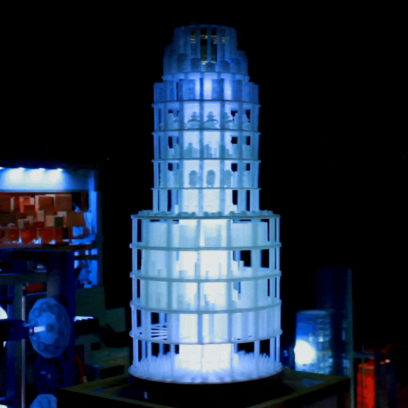 Each sculpture in the installation actualizes an animated image through harmonized intermittency or causes aberration through irregular motion. Viewers will find various ways to experience Automated by peering into windows and buildings, watching the cinematic cycles embedded in each sculpture, and making secret discoveries of light and shadow.