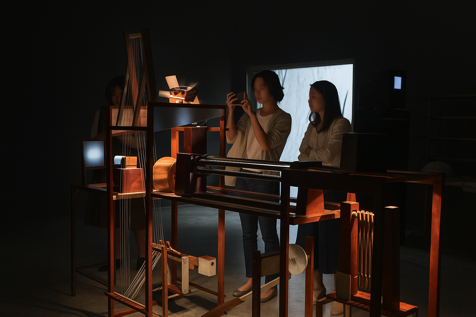As viewers move around the installation, the projected images shift, align, and dissolve—transforming cinematic space into a spatial, embodied experience. Light becomes both medium and product: intangible, looping, and shaped by one’s position within the system. The work invites reflection on how cinema itself has been both illusion and industry—a choreography of labor, vision, and mechanical time.